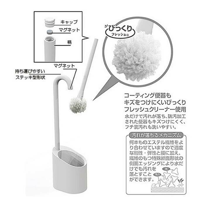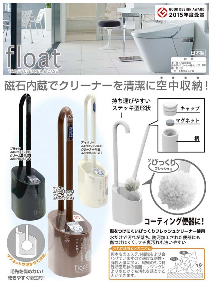 商品詳細商品説明 float フロートのトイレブラシセットですシンプルでスタイリッシュなデザインのフロートトイレクリーナー&ケースです 磁石内蔵でクリーナーを清潔に空中収納します クリーナーの持ち手の先と本体のステッキ持ち手の先に磁石を内蔵しているので簡単につけはずしができ、見た目もスタイリッシュです ブラシの毛先を傷めず、乾きやすく衛生的です傷をつけにくいびっくりフレッシュクリーナーを使用しています 毛にウェーブ加工を施しているので気になる水ハネを抑えられます 何本ものエステル繊維をより合わせていますので適度な剛性・弾性と腰に加え、繊維のもつ特殊断面形状の側面エッジングにより水だけでも汚れを落とすことができます 防汚加工された便器にも傷つけにくく、フチ裏汚れも洗いやすくなっていますコーティング便器におススメです! ケースは持ち運びしやすいステッキ型形状になっています素材ケース本体:ABS樹脂持ち手、クリーナー柄、リング:PPブラシ:ポリエステル磁石:鉄サイズ本体 約9.2×38×12.7cm耐熱温度約90度 生産国日本JAN4979508585035 49795085850284979508585042 ご注意 ※商品撮影にはデジタルカメラを使用しております。