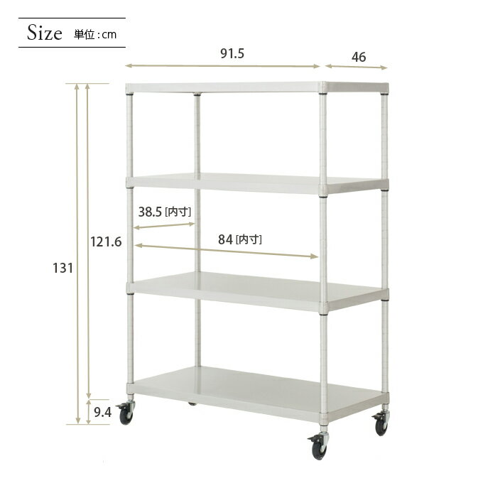 商品仕様 商品シリーズ ルミナス プレミアムライン ソリッドシェルフラック 4段 幅91.5×奥行46×高さ131cm ZSH-90124 外形寸法 アジャスタ装着時:幅91.5×奥行46×高さ122.5cmキャスター装着時:幅91.5×奥行46×高さ131cm シェルフ内寸 幅84×奥行38.5cm 備考 ネット限定商品の為、パーツ単位での出荷となります。