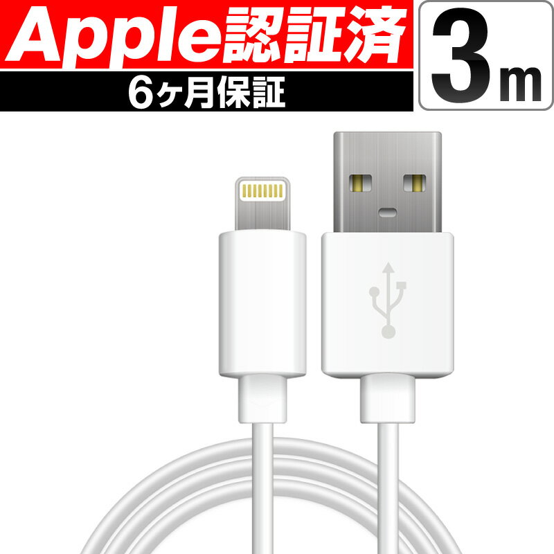 iPhone iPad iPod MFI認証 Lightningケーブル ホワイト 正規品 3m Lightning USBケーブル 超ロング 充電 同期 充電ケーブル 充電器 6ヶ月保証 air-j UKJ-LPSS3MWH